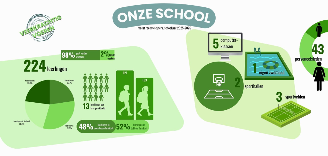 - moderne infrastructuur: computerlokalen, labo’s, turnzaal, zwembad, sporthal, sportvelden en een bibliotheek op de campus;